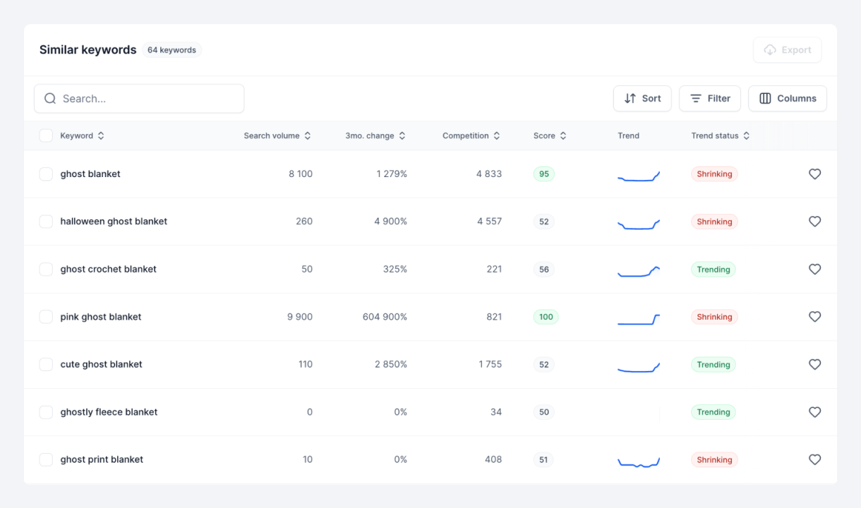 Imagine you’re selling a cute, cozy ghost-themed blanket. You type “Ghost Blanket” into the search bar, and voilà—keyword metrics appear: